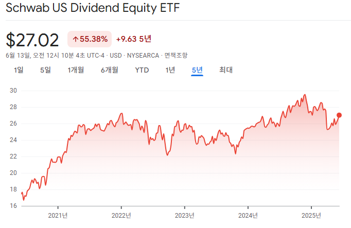 이 차트는 SCHD가 단기적인 급등보다는 장기적으로 우상향하는 안정적인 주가 흐름을 보여주었음을 시사합니다.